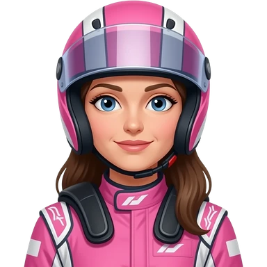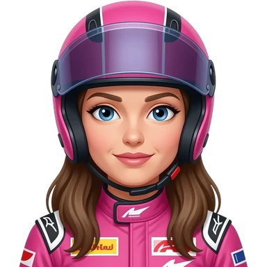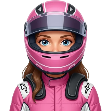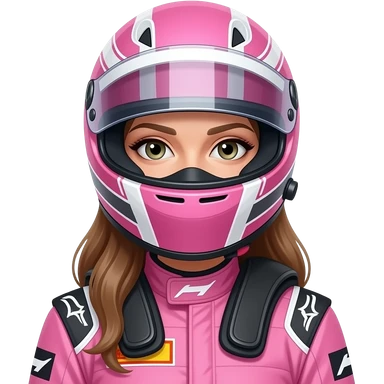 create woman using f1 pink costume no sponsor and f1 helm that cover the face, the woman have long hair inside helm emoji