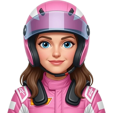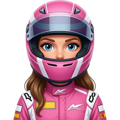 create woman using f1 pink costume and f1 helm, the woman have long hair inside helm, the helm closed the face emoji