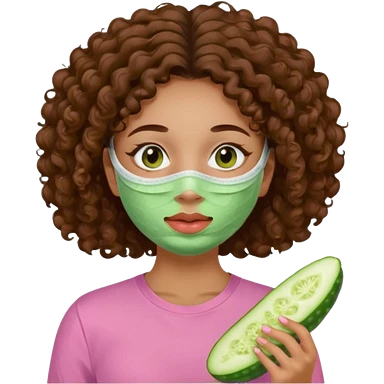 lightskin girl having a spa day with green skincare facemask and cucumbers on her eyes and brown curly hair and a pink shirt emoji