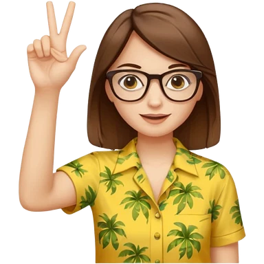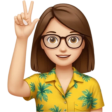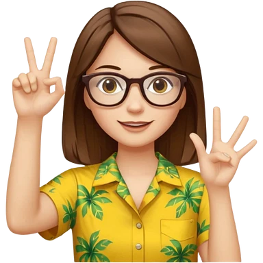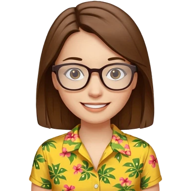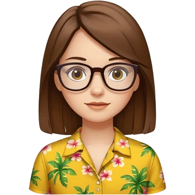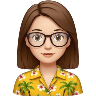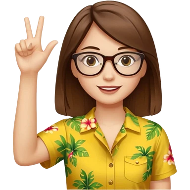 Hawaii female with white skin. Shoulder length straight brown hair. Brown eyes with glasses. Female wearing yellow Hawaiian print shirt. emoji