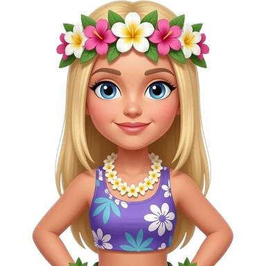 Hawaiian hula dancer with straight blonde hair and blue eyes with a body and a flower crown emoji | AI Emoji Generator