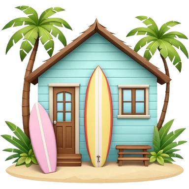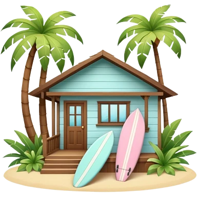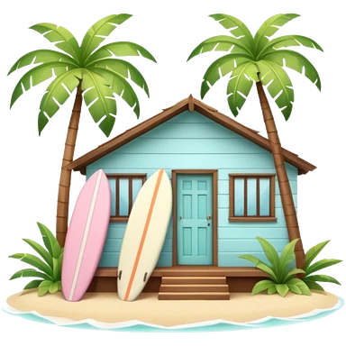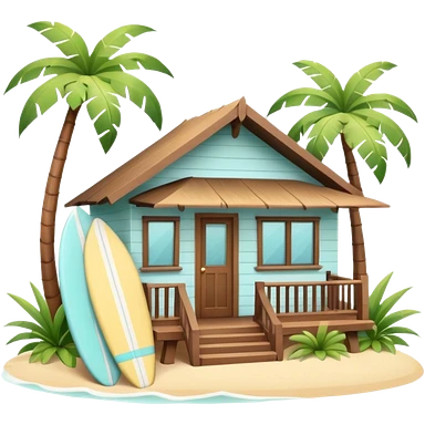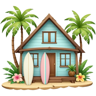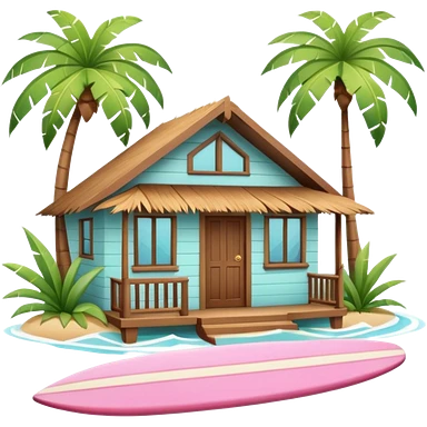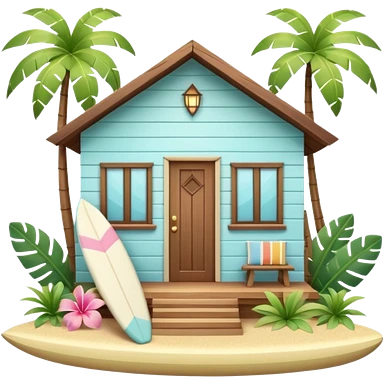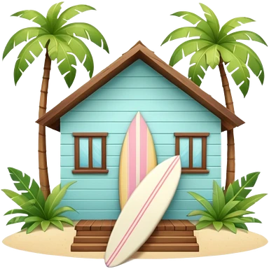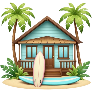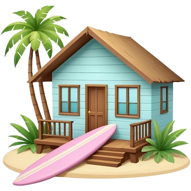 Hawaiian bungalow house, pastel colors, wooden porch, surfboard leaning on wall, palm leaves, tropical vibe, cute mobile game icon style, 3D cartoon, clean background, no text emoji