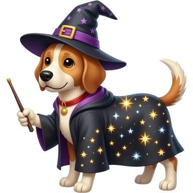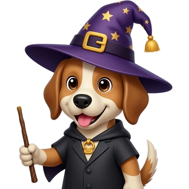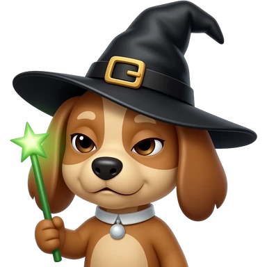 Haz un emoji de ese perro pero con gorra y vestimenta de bruja. Con el bastón y magia emoji