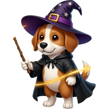 Haz un emoji de ese perro pero con gorra y vestimenta de bruja. Con el bastón y magia la mitad del cuerpo y más Mágico emoji