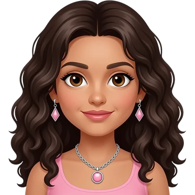 Morena, ojos cafes, perolo largo rizado con aretes, y un lacito rosa emoji