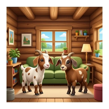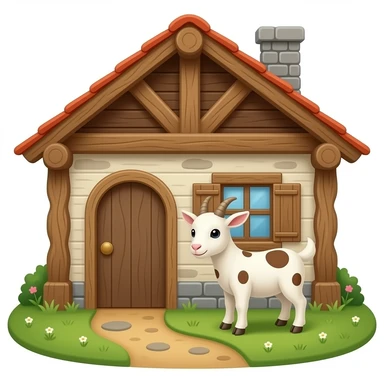 hazme la parte de dentro de una casa, la casa tiene que ser rustica. Pon algunas (2 o 3) cabras pequeñas con manchas marrones DENTRO de la casa. emoji