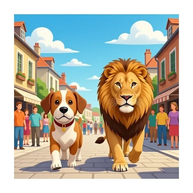 hazme un perro y un leon caminando por un pueblo con muchas personas emoji