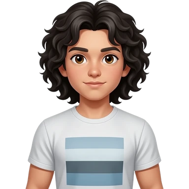 Hazme un chico con pelo un poco mas que por los hombros, rizado y negro, ojos marrones. Y que este un poco musculoso. Que tenga camiseta. Que se vea el cuerpo entero y tenga unos doce años emoji | AI Emoji Generator