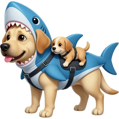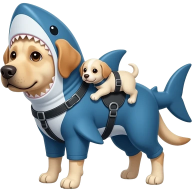 Hazme un emoji de un perro labrador,con un traje de tiburón azul,y haz que lleve en un arnés a otro perro bebe,y también haz que el papá sea pequeño emoji | AI Emoji Generator