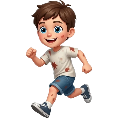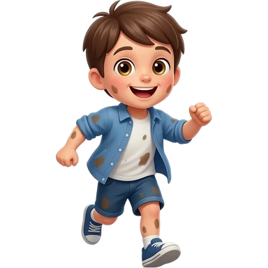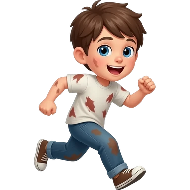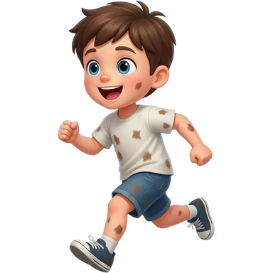 un chico con los ojos hazules i el pelo castaño. Tiene 5 años i esta emocionado. tiene la ropa manchada esta corriendo emoji