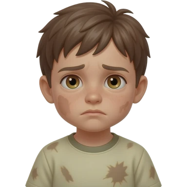 un chico con los ojos hazules i el pelo castaño. Tiene 5 años i esta cansado . tiene la ropa manchada emoji