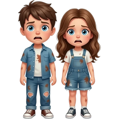 chico y chica son hermanos,se estan preguntando asustados donde estan, el chico castanyo i con pelo corto y la chica pelo suelto y color avellana y los dos tienen ojos azules son hermanos estan depie se les ve los pies su ropa esta manchada emoji