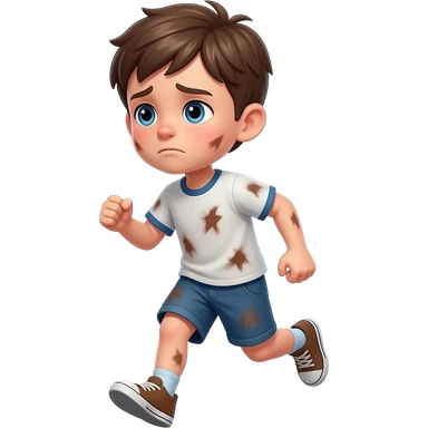 un chico con los ojos hazules i el pelo castaño. Tiene 5 años i esta cansado . tiene la ropa manchada esta corriendo emoji