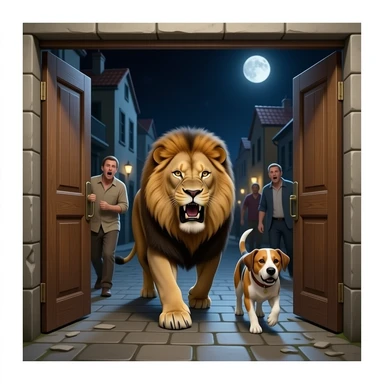 quiero que salga en un publo un leon y un perro que esten por la ciudad dando vulta con mucha hambre pero que no deestrozen nada tambien quiero que en las puertas hayan puesto madera colocada para que no entren que la gente de el pueblo que este asustada y que sea de noche que no entren en casas emoji