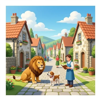 quiero un pueblo donde las personas tengan que aprender a vivir con un leon y un perrro por si un dia volvian al pueblo y que sea realista emoji