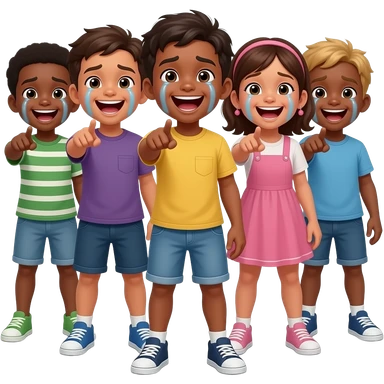 UNOS NIÑOS QUE SE ESTÁN RIENDO MUCHO. LOS NIÑO ESTA EN BUENA FORMA. CUERPO COMPLETO. QUE ESTÉ LLORANDO DE LA RISA. QUE SEA NEGRO. QUE PAREZCA QUE SE ESTAN BURLANDO A LA CAMARA. QUE SEÑALEN A LA CAMARA emoji