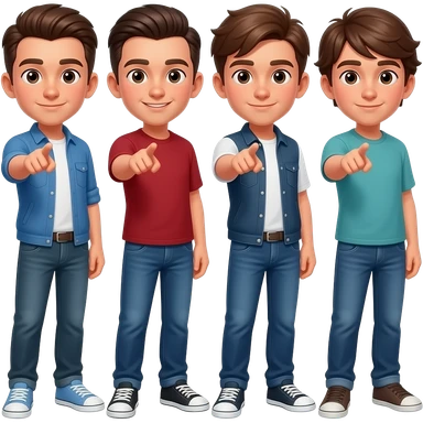Hazme unos 4 chicos burlandose de alguien i aseñalandolo para delante, que se les vea todo el cuerpo i que sean niños guapos i uno que tenga un peinado de chulito emoji