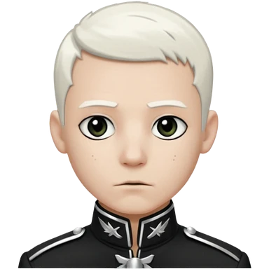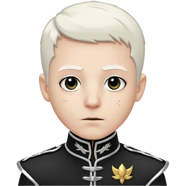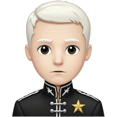 Head and shoulders emoji of a pale man with short white hair, wearing a black marching band jacket with silver trim. black eyeliner. Expression stoic, commanding, and theatrical, heroic emo styleemoji
