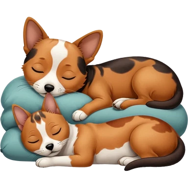 Calico cat with black nose sleeping near a dachshund dog emoji