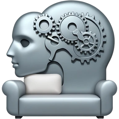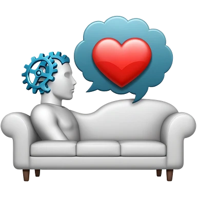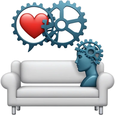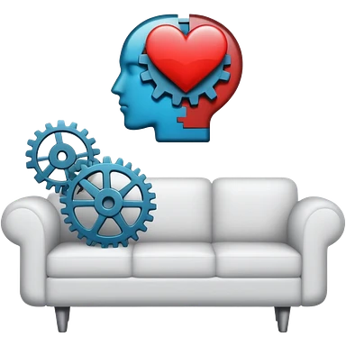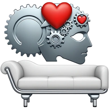 An icon featuring a human head silhouette with gears and a heart inside, symbolizing psychology. The design includes a therapy couch and a speech bubble, representing mental health and communication. Transparent background highlights the study of the human mind and behavior. emoji