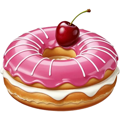 Round donut with smooth shade pink icing and thin white drizzle lines, golden-brown dough visible on the sides. White whipped cream dollop in the center topped with a glossy red cherry and stem, clean studio lighting, pure white background, realistic minimal emoji-style. emoji