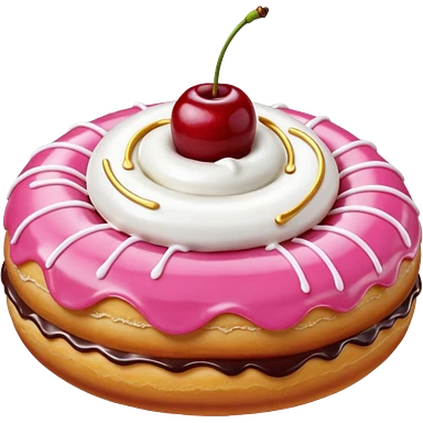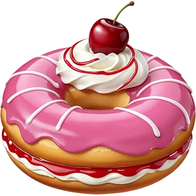 Round donut with smooth pink icing and thin white drizzle lines, golden-brown dough visible on the sides. White whipped cream dollop in the center topped with a glossy red cherry and stem, clean studio lighting, pure white background, realistic minimal emoji-style. emoji