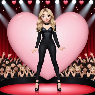 Sabrina carpenter singing at concert wearing a black sparkle jumpsuit and black hyper sparkle heels. There is a huge crowd and light pink stage setting. She is standing in the center stage part that is in the shape of a red heart and it extends from the main stage emoji
