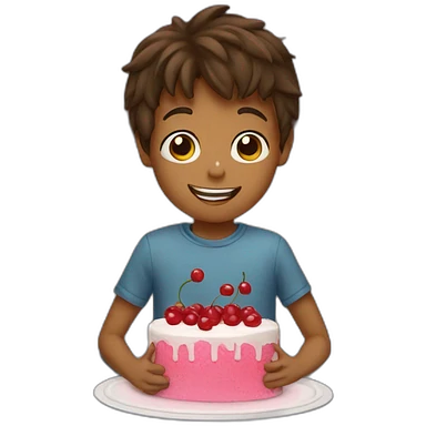 Boy playing a U shaped cherrie topped cake in bed emoji