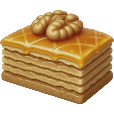 Minimal clean background. A 3D emoji-style Azerbaijani pakhlava slice, diamond-shaped with layered texture and a walnut on top. Honey-glazed glossy surface, rich golden-brown tones. Soft lighting, Apple emoji style, clean centered layout emoji