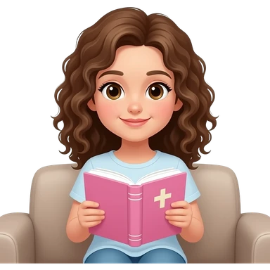 Chica con en pelo rizado color castaño y piel Blanca, sentada en un sofá con una biblia rosa emoji