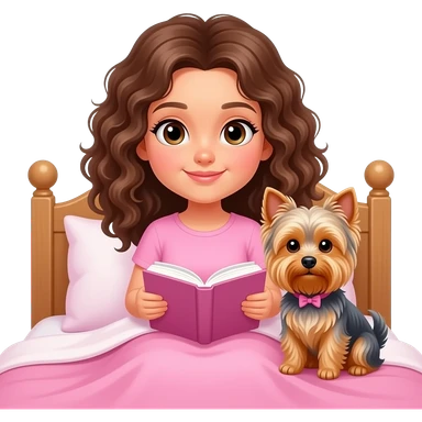 Chica con en pelo rizado color castaño y piel Blanca, sentada en su cama con un libro y su perro yorksai y que ella vaya de rosa emoji