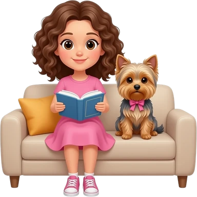 Chica con en pelo rizado color castaño y piel Blanca, sentada en un sofa con un libro y su perro yorksai y que ella vaya de rosa emoji