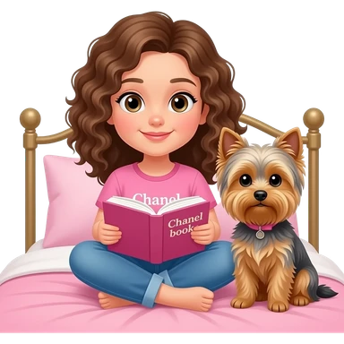 Chica con en pelo rizado color castaño y piel Blanca, sentada en su cama con un libro y su perro yorksai y que ella vaya de rosa y que ponga un texto de Chanel books emoji