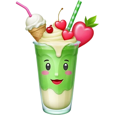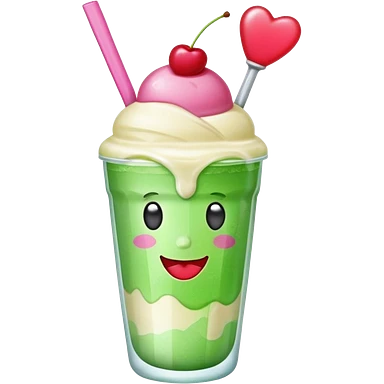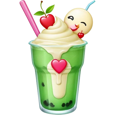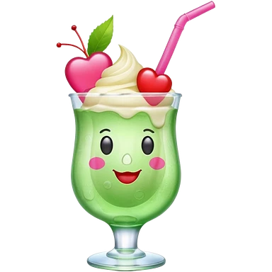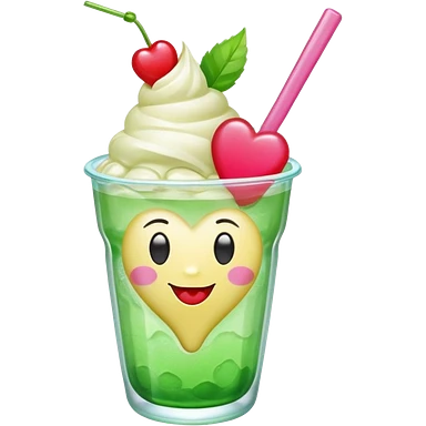 clear emoji-style of a green soda float with ice, vanilla ice cream scoop, two red cherries, pink heart-shaped straw, simple shapes, bright colors, glossy, kawaii style, centered, transparent background emoji