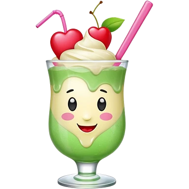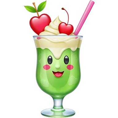 Cute emoji-style illustration of a green soda float with ice, vanilla ice cream scoop, two red cherries, pink heart-shaped straw, simple shapes, bright colors, glossy, kawaii style, centered, transparent background emoji