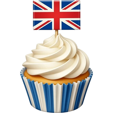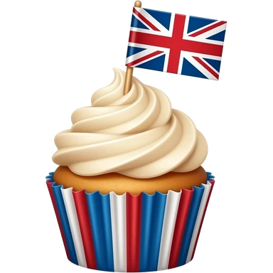 Elegant cupcake with small Union Jack topper, isolated, centered, no background, no table, no scenery, no text, soft cream frosting, refined red white and blue accents emoji