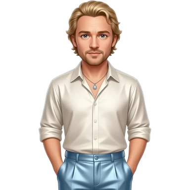 Heath Ledger with hazel eyes, golden blonde hair, ivory metallic shirt, light steel blue metallic baggy pants, necklace emoji