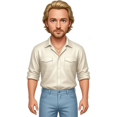 Heath Ledger with hazel eyes, golden blonde hair, ivory metallic shirt, light steel blue baggy pants, necklace emoji
