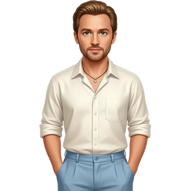 Heath Ledger with brown eyes, golden brown hair, ivory metallic shirt, light steel blue baggy pants, necklace emoji