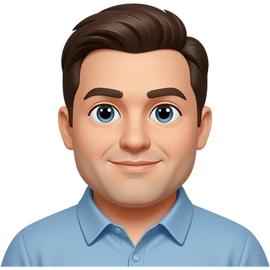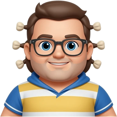 50-year-old heavyset man with very wide face and prominent square jawline. Little to no hair on the sides with some hair on top, balding pattern. Large dark square glasses. Serious-relaxed expression. Light gray jacket that fits his larger frame, white shirt with blue checkered pattern. emoji