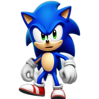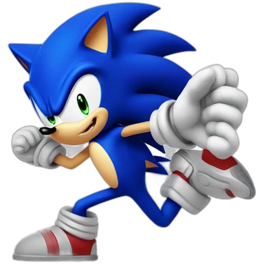 Blue anthropomorphic hedgehog, spiky hair, large green eyes, confident smile.Wearing red sneakers with white straps and white gloves. emoji
