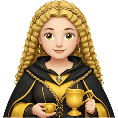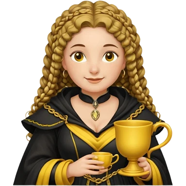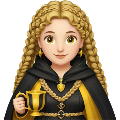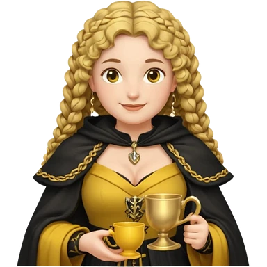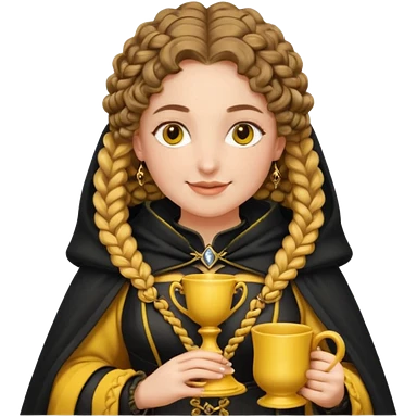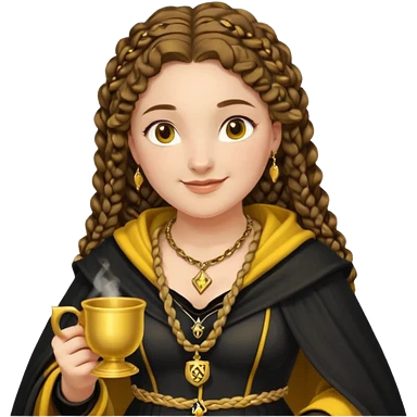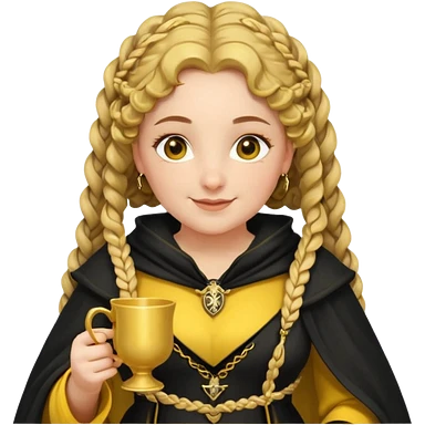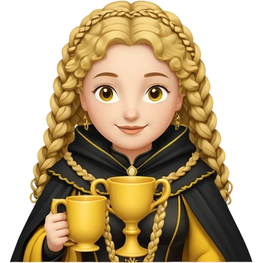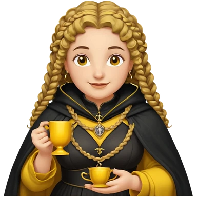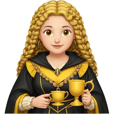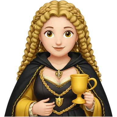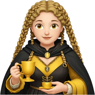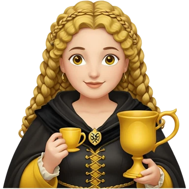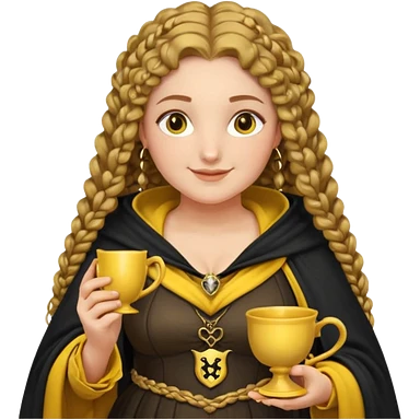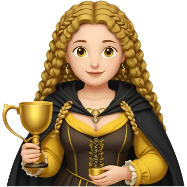 Helga Hufflepuff, 2 curly thick brown braids, yellow-black medieval dress, black cloak decorated with gold braiding, tiny two-handled shiny yellow-gold cup, very kind smile, curvy busty sweet woman, thick rosy cheeks emoji | AI Emoji Generator
