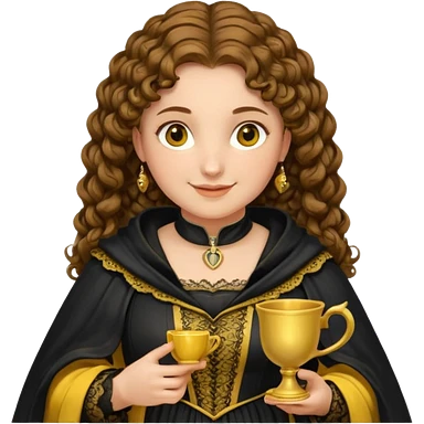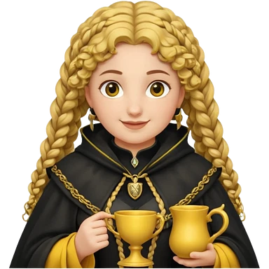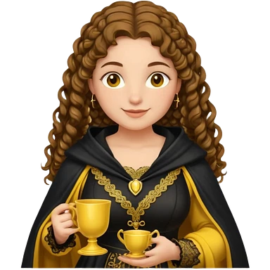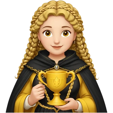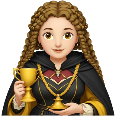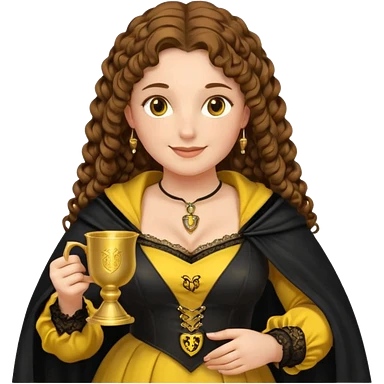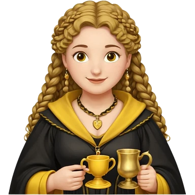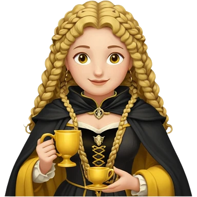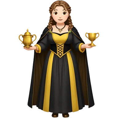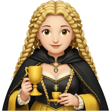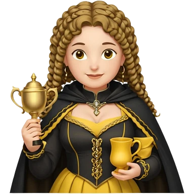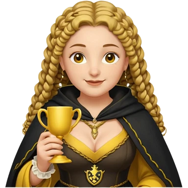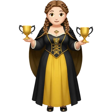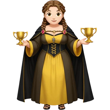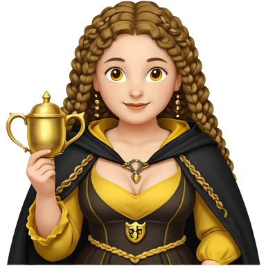 Helga Hufflepuff, brown-haired, 2 long brown braids, yellow-black medieval dress, deep neckline, black cloak decorated with gold braiding, small magic wand made of wood, tiny two-handled shiny yellow-gold cup, very kind smile, curvy busty sweet woman, macromastia, thick round rosy cheeksemoji