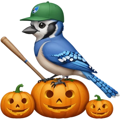 bluejay sitting on Halloween pumpkin wearing bluejay baseball hat holding a bat emoji