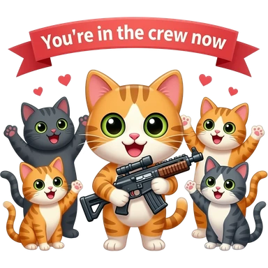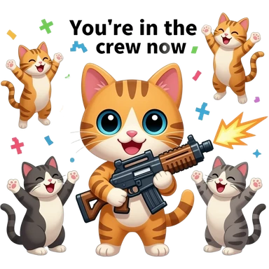 1 kitten, oversized pixelated weapon, 8-bit retro style, sticker, big happy eyes, bigger cats around cheering, sprite celebration TEXT: "You're in the crew now" emoji