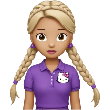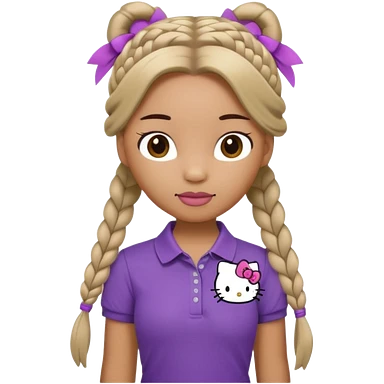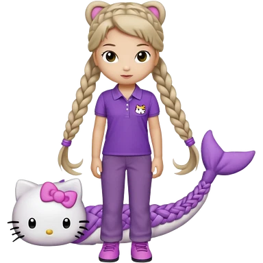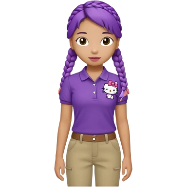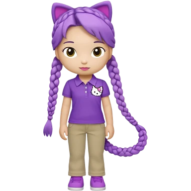 hello kitty wearing purple polo shirt and kyaki pants with long fishtail braids baddie with 2025 efect emoji
