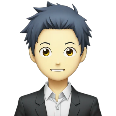 A futuristic assassin with a sleek black suit, short purple hair, and glowing red visor emoji