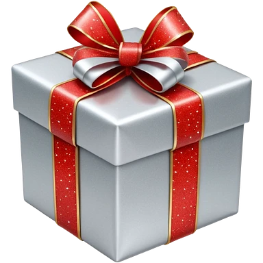 Hyperrealism wrapped christmas gift, with realistic detailed silver and red glitter 3D ribbon emoji