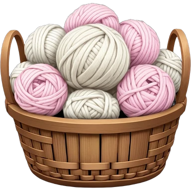detailed, hyperrealism, still life beautiful ball of chunky white to light pink color wool, placed in a dark wooden basket, with other types of wool, to knit a blanket. Transparent background emoji