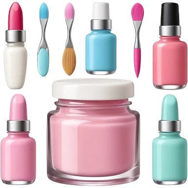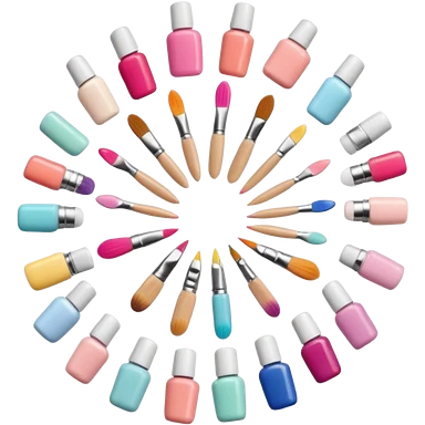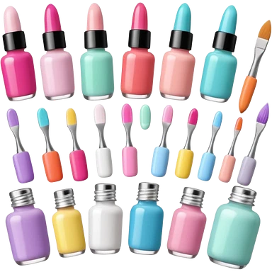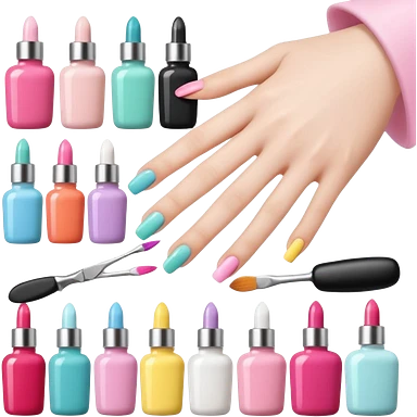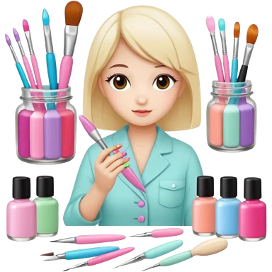 Minimalist nail art sticker pack featuring a cute female nail artist, nail tools like brushes and files, colorful nail polish bottles, small decorated nails, simple and clean design, pastel colors, kawaii style, delicate and charming, high-resolution, perfect for nail stickers emoji